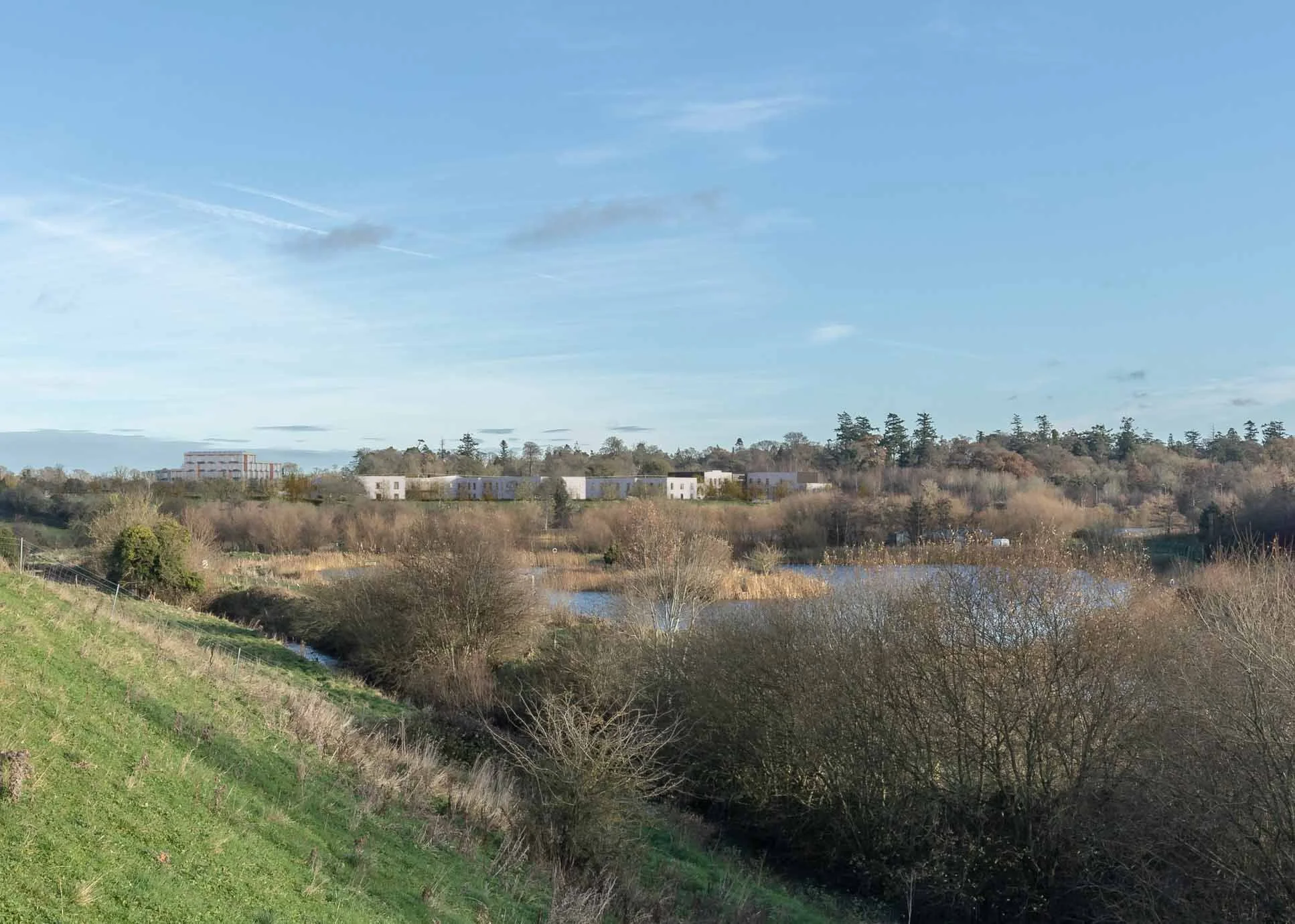The site is currently a greenfield site, divided and bordered by native hedgerows and mature trees, which have been taken as a starting point in defining our site and will be retained and complemented, to promote biodiversity and retain the natural feel of the site. The site is around 20 minutes from Maynooth on foot. Pedestrian and vehicular access routes were analysed, and paths proposed on anticipated desire lines. The proposed development provides for 24262sqm of public open space which will form part of the Rye River Walk.